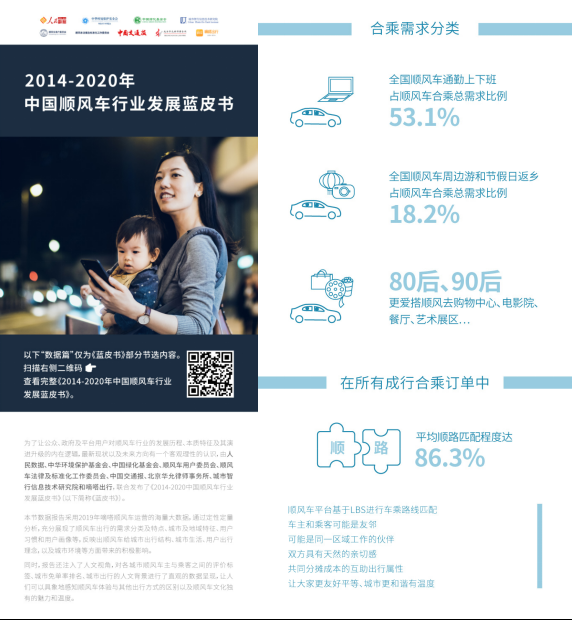 為了讓公眾,政府及平臺用戶,對順風車行業(yè)的發(fā)展歷程,本質特征及其演進升級的內在邏輯,最新現(xiàn)狀以及未來方向有一個客觀理性的認識,由人民數(shù)據(jù)、中華環(huán)境保護基金會,中國綠化基金會,順風車用戶委員會、順風車法律及標準化工作委員會、中國交通報、北京華允律師事務所、城市智行信息技術研究院和嘀嗒出行,于6月9日聯(lián)合發(fā)布了《2014-2020年中國順風車行業(yè)發(fā)展藍皮書》(以下簡稱《藍皮書》)。