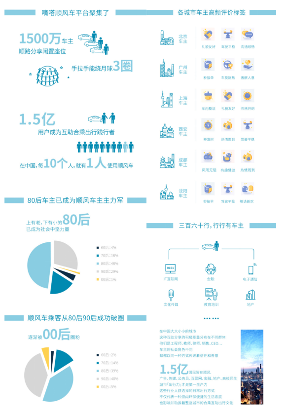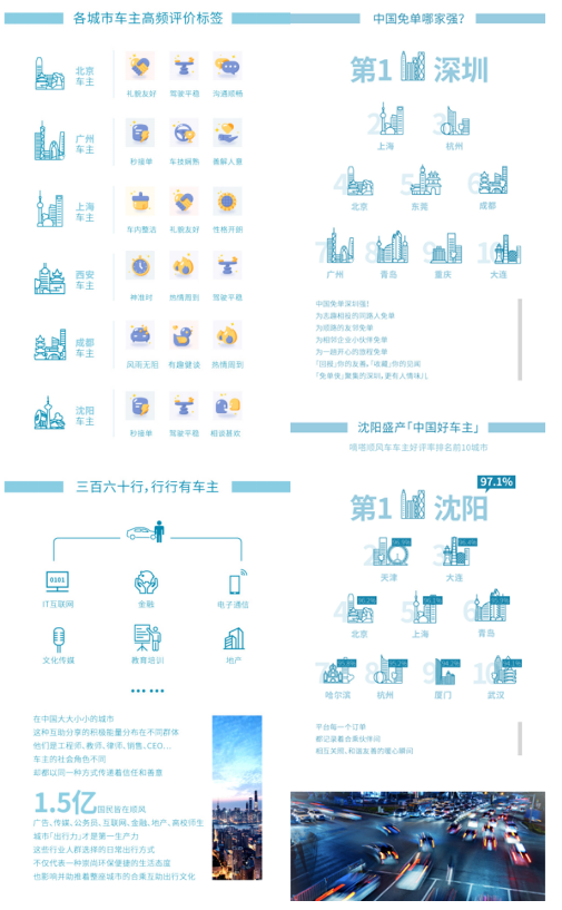 《報告》不僅充分展現(xiàn)順風車出行的需求分類及特點、城市及地域特征、用戶習慣和用戶畫像等,反映出順風車給城市出行結構、城市生活、用戶出行理念,以及城市環(huán)境等方面帶來的積極影響;還注入了人文視角,對各城市順風車評價標簽,城市免單率排名,城市人文特征進行了直觀的數(shù)據(jù)呈現(xiàn),讓人們可以具象地感知順風車文化獨有的魅力和溫度。