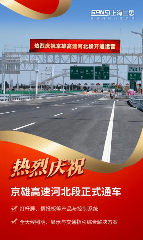 除創(chuàng)新功能的智慧燈桿外,京雄高速主線上所應用到的LED陶瓷像素路燈、LED照明燈具、收費站頂棚式情報板、LED可變限速標志、門架式大型情報板、LED交通誘導屏等道路照明與智能交通類的LED設備及控制系統(tǒng),也是由上海三思研發(fā)供應,設備總數(shù)數(shù)萬套(臺),形成一套涵蓋燈桿屏、情報板等產(chǎn)品與控制系統(tǒng)的、完整的全天候照明、顯示與交通指引綜合解決方案。