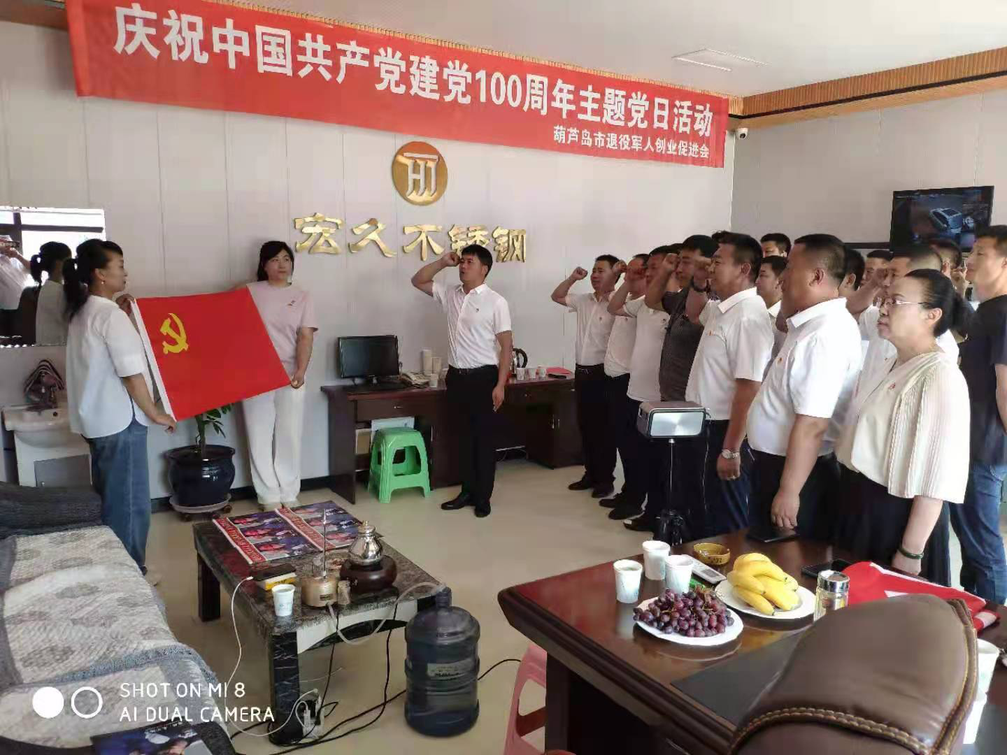 “不忘入黨初心,永葆軍人本色。重溫入黨誓詞,堅(jiān)定使命擔(dān)當(dāng)。”2021年6月22日上午,遼寧省葫蘆島市退役軍人創(chuàng)業(yè)促進(jìn)會(以下簡稱軍創(chuàng)會)30名退役軍人黨員,在遼寧宏久金屬制造有限公司隆重舉行“退役不失志,兵心永向黨”暨慶祝中國共產(chǎn)黨建黨100周年主題黨日活動。軍創(chuàng)會黨支部書記原海軍飛行學(xué)院副政委郭興、軍創(chuàng)會會長緱金勝及部分會員單位參加了慶;顒。