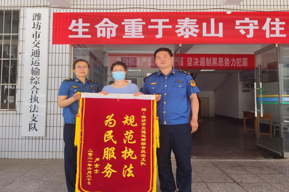 “濰坊市交通運輸綜合執(zhí)法支隊真的是為群眾辦實事、解難題的模范窗口單位啊,真是太感謝了。”為表謝意,6月21日,盧女士為支隊送來了錦旗,同時對駕駛員表示感謝。((邵長孝 孫煥良/文)
