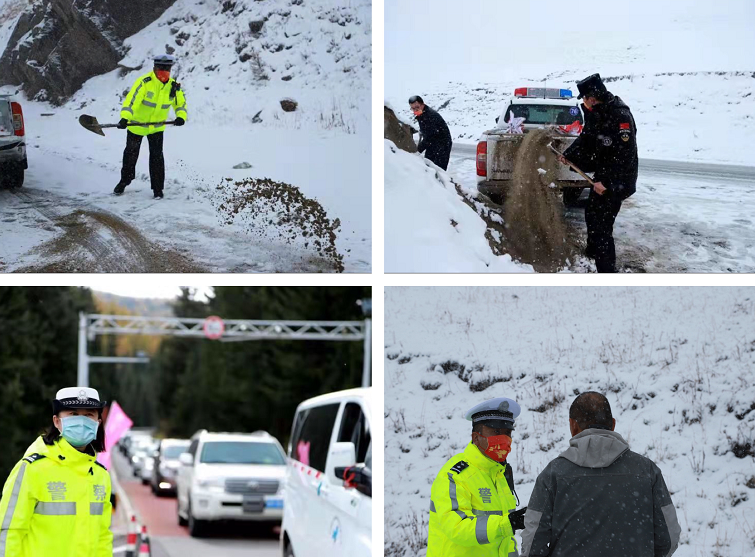 路因山回環(huán),山因路韻致;秋景繽紛美,冬雪入約至?{斯的路在山路間起起伏伏,彎彎轉(zhuǎn)轉(zhuǎn)。當(dāng)雪降臨,白雪勾勒山林,水墨意韻成畫,美不勝收。山路幽幽是美景,一場雪讓路面變得濕滑,也是安全隱患所在。10月5日上午,從凌晨3時(shí)起至11時(shí),喀納斯景區(qū)公安局交警大隊(duì)民警王文已經(jīng)在S232線賈登峪至52公里執(zhí)勤點(diǎn)往返巡邏了4個(gè)來回,及時(shí)報(bào)送天氣情況及路況。當(dāng)雪越下越大,道路通行變差后,他立即投入到道路安全保障中,開始和戰(zhàn)友們一起在結(jié)冰路面拋灑防滑沙,時(shí)而去路面指揮疏導(dǎo),一邊指揮車輛,一邊向駕駛員叮囑冰雪路面注意事項(xiàng)。等到天氣轉(zhuǎn)晴,路面積雪融化,車輛可以暢行時(shí),他又前往其他路段支援工作去了。雖然早餐和午餐都沒有吃東西,將近24小時(shí)沒有休息,但身為一名交警看著濕滑的路面,他仍然堅(jiān)持在一線疏導(dǎo)交通。他是一個(gè)普普通通的人,也是一名平凡崗位上的人民警察,因?yàn)轭^頂警徽,身著藏藍(lán),生命里就刻上了若牛重負(fù)的使命感,寢食難安的責(zé)任感。