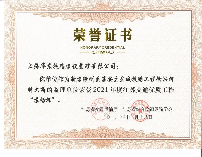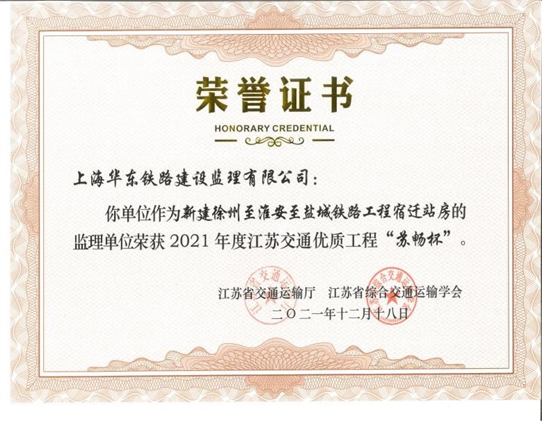 ——上海華東鐵路建設(shè)監(jiān)理有限公司監(jiān)理的徐鹽鐵路兩項工程獲2021年度江蘇交通優(yōu)質(zhì)工程獎