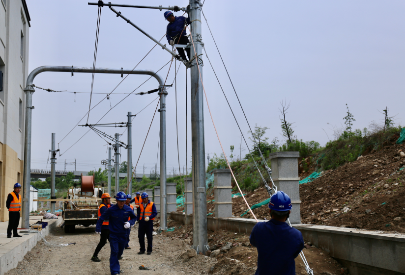 5月10日,中國(guó)中鐵電氣化局運(yùn)管公司上海維管處南京維管段職工在南京市棲霞區(qū)馬群地鐵培訓(xùn)基地鉚足馬力趕工期。當(dāng)天,作業(yè)人員主要對(duì)培訓(xùn)基地練兵場(chǎng)接觸網(wǎng)線索進(jìn)行架設(shè)、安裝,施工作業(yè)人員完成饋線架設(shè)216米。
