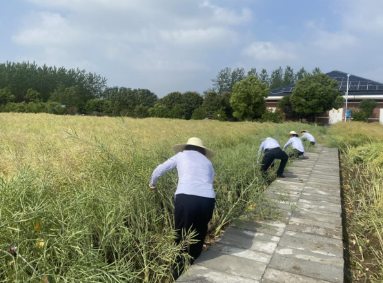 眼下,正值油菜豐收季,在湖北交投江漢運營公司張金管理所院內(nèi)的油菜田里,十多名張金所員工正忙得熱火朝天,他們頭戴草帽,手握鐮刀,穿梭在田間,臉上洋溢著豐收的喜悅。