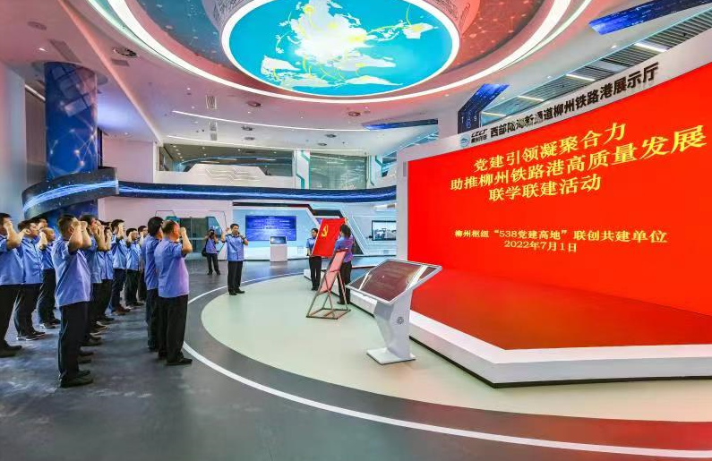 2022年7月1日上午,柳州車站、寧鐵物資公司黨委,柳州機(jī)務(wù)段、工務(wù)段、電務(wù)段、車輛段、貨運(yùn)中心和鐵建公司黨委,在西部陸海新通道柳州鐵路港核心區(qū),舉辦柳州樞紐“538黨建高地”聯(lián)創(chuàng)共建 “黨建引領(lǐng)凝聚合力,助推柳州鐵路港高質(zhì)量發(fā)展”主題聯(lián)學(xué)聯(lián)建活動。該活動由柳州車站黨委牽頭、物資公司黨委主辦,8家單位黨委書記或副書記、組織助理員、宣傳助理員、聯(lián)創(chuàng)共建承載黨支部支部書記參加。