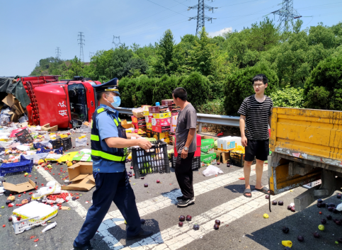 據(jù)悉,當(dāng)天中午12時(shí)許,四支隊(duì)一大隊(duì)執(zhí)法人員巡查至滬昆高速公路往南昌方向480km處時(shí),發(fā)現(xiàn)一輛小貨車側(cè)翻,車體橫跨于道路中央,大量水果灑落在行車道、超車道上,過往車輛紛紛減速避讓,司機(jī)陳師傅一籌莫展。執(zhí)法人員見此情形,迅速靠邊停車,拉響警報(bào)器,并在后方設(shè)置警示標(biāo)志提醒過往車輛減速慢行。同時(shí),執(zhí)法人員將現(xiàn)場(chǎng)情況通知高速交警和清障施救部門。并且?guī)椭囍鲹焓八⒖焖偾謇憩F(xiàn)場(chǎng)。經(jīng)過各單位共同努力,近百箱的水果裝進(jìn)轉(zhuǎn)運(yùn)車,側(cè)翻的小貨車被拖離現(xiàn)場(chǎng),道路恢復(fù)正常通行,最大程度幫助司機(jī)挽回了經(jīng)濟(jì)損失。