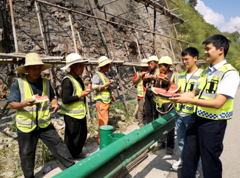 一輛滿載夏日溫情的車輛緩緩?fù)T诼愤叄?ldquo;師傅們歇一歇,吃塊西瓜解解暑。”湖北交投鄂西運(yùn)營公司第三綜合巡檢辦工作人員向他們遞上了冰爽的西瓜和礦泉水,“您們辛苦了!天氣太熱,休息一下……”工作人員一邊遞西瓜和礦泉水,一邊與工人們親切交談,“中午溫度特別高,容易中暑,一定要休息下,把施工時(shí)間調(diào)整好,盡量避開高溫時(shí)段。”