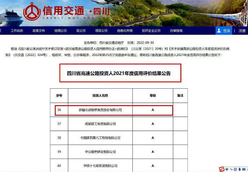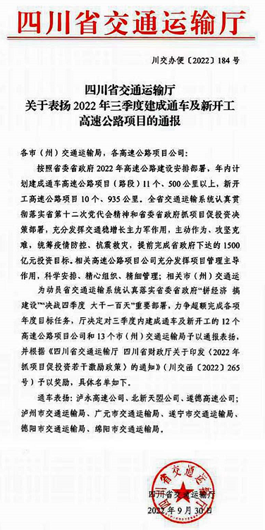 9月30日,四川省交通運輸廳發(fā)出通報:廣平高速項目項目公司——四川北新天曌投資發(fā)展有限公司受到通報表揚;同日,四川省交通運輸廳官網(wǎng)發(fā)布公告:廣平高速項目投資人——新疆北新路橋集團股份有限公司被評為四川省高速公路投資人2021年度信用評價“A”級。廣平高速項目自開工以來,始終面對高橋隧比、高地震烈度、高地應(yīng)力和軟弱圍巖“三高一軟”的工程特點,先后迎戰(zhàn)川西北2018百年一遇特大洪災(zāi)、全球2020突如其來新冠疫情,特別是2022年積極應(yīng)對全線范圍的疫、洪、旱、高溫、限電、地震交織疊加的“六重考驗”,新疆北新路橋集團股份有限公司秉持“誠實守信、追求卓越”的企業(yè)價值觀,圓滿完成投資任務(wù),充分彰顯了國企擔當;四川北新天曌投資發(fā)展有限公司充分發(fā)揮項目管理主導作用,團結(jié)帶領(lǐng)全體參建單位和人員發(fā)揚“兵團精神”,攻堅克難、頑強拼搏,實現(xiàn)項目青川段提前通車運營,創(chuàng)造了“北新速度”。