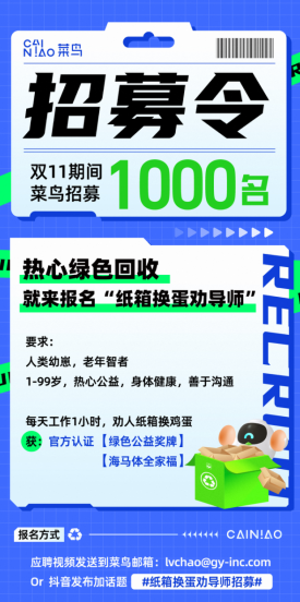 為了打消大家的疑慮,菜鳥希望通過招募官方認(rèn)可的“紙箱換蛋勸導(dǎo)師”,在驛站現(xiàn)場(chǎng)為消費(fèi)者普及環(huán)保知識(shí),協(xié)助消費(fèi)者參與綠色回收。