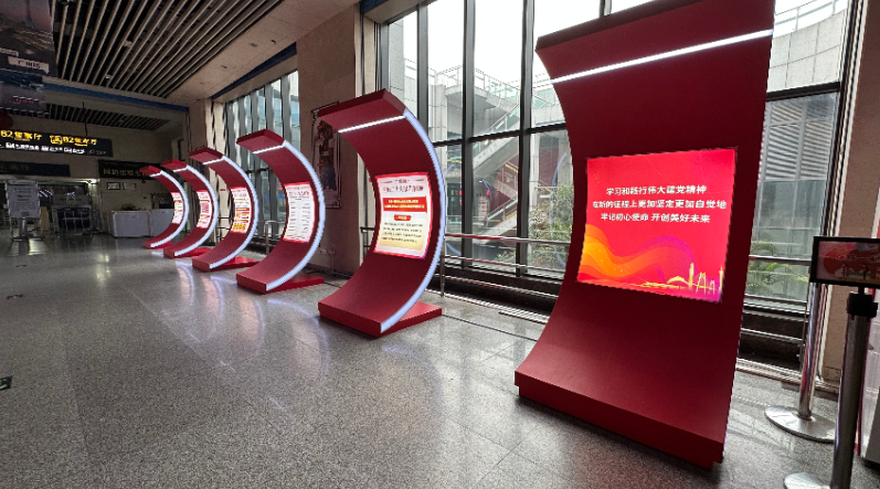 為深入學(xué)習(xí)宣傳貫徹黨的二十大精神,推動黨的二十大精神在廣大群眾中入腦入心,在基層落地生根,近日,廣州公交集團(tuán)交通站場中心下屬南站樞紐公司在廣州南汽車站打造了一個(gè)宣傳黨的二十大精神專題紅色站場。在廣州南汽車站候車大廳里,一個(gè)個(gè)拱形狀的紅色燈箱映入廣大旅客的眼簾,燈箱內(nèi)容圍繞黨的二十大主題與主要成果、全面建設(shè)社會主義現(xiàn)代化國家的目標(biāo)任務(wù)、堅(jiān)持黨的全面領(lǐng)導(dǎo)、加快構(gòu)建新發(fā)展格局、推進(jìn)法治中國建設(shè)等方面,對黨的二十大精神進(jìn)行了系統(tǒng)的宣展。此外,站場還在服務(wù)臺放置黨的二十大報(bào)告、黨史等書籍供廣大旅客借閱,讓人民群眾學(xué)習(xí)黨的二十大精神熱潮不斷、熱度不減,讓站場成為傳播黨的理論和紅色文化基地。