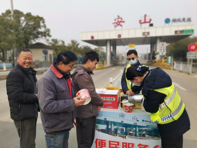 安山收費(fèi)站工作人員一邊為滯留在入口的司乘耐心做好宣傳解釋工作,一邊為滯留時間較長的司乘準(zhǔn)備開水、姜湯、方便面等物資,緩解司乘焦急等待情緒。司乘喝著暖暖的姜湯,吃上熱騰騰的方便面,紛紛對收費(fèi)站工作人員豎起了大拇指。來自咸寧的龔先生端著收費(fèi)員給他泡好的方面,感激地說:“早飯沒顧著吃就趕過來,沒想到封道了。還好有你們的體貼服務(wù),真暖心!”