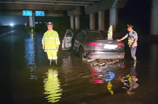 保定支隊博野大隊值守人員因曲港高速和大廣高速互通部分積水較深,對過往車輛進行分流,在一線連續(xù)奮戰(zhàn)近15個小時。