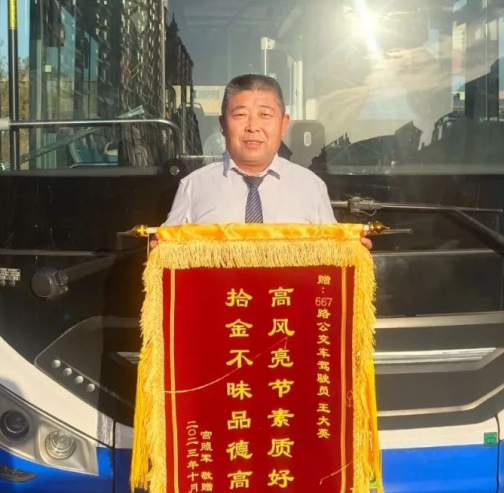 同樣是11月5日,市民宮先生為了表達(dá)對(duì)667路駕駛員王大英拾金不昧行為的感謝,將一枚繡著“高風(fēng)亮節(jié)素質(zhì)好 拾金不昧品德高”的錦旗送到城鄉(xiāng)公交場(chǎng)站。