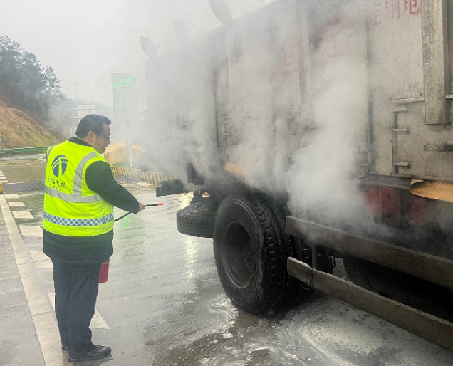 1月17日下午17時(shí)許,一輛大貨車頂著濃煙駛?cè)牒苯煌抖跷鞅边\(yùn)營(yíng)公司所轄S77十淅高速丁家營(yíng)收費(fèi)站超寬道,車尾后方兩組輪胎突然起火,大貨車瞬間變成“火車”。千鈞一發(fā)之際,現(xiàn)場(chǎng)收費(fèi)員秒變“消防員”,火速進(jìn)行撲火救援,及時(shí)控制住火勢(shì),成功化險(xiǎn)為夷。