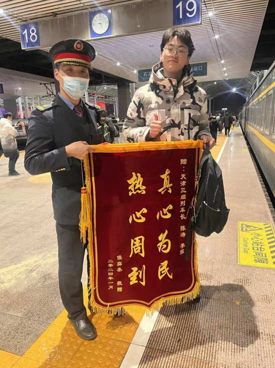 直至T55次返回石家莊車站,小侯同學(xué)早已等候在站臺(tái),看到自己失而復(fù)得的背包和一眾物品,小侯手拿錦旗向列車長(zhǎng)及列車工作人員表示了萬(wàn)分感謝“沒(méi)想到這么快就找到了,這個(gè)背包對(duì)我太重要了,非常感謝,非常感謝”!李強(qiáng)車長(zhǎng)趕忙回應(yīng)道:“這是我們的職責(zé),是我們應(yīng)該做的”。