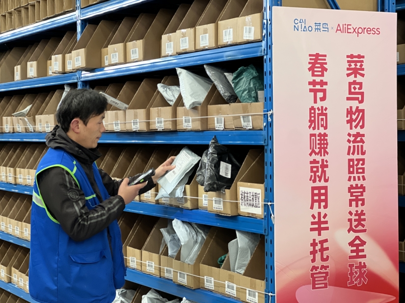 (菜鳥速賣通的杭州倉庫內(nèi),工作人員正在上架春節(jié)貨品)