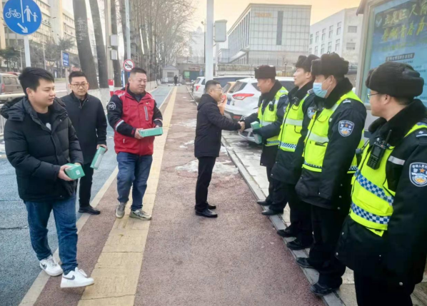 圓通快遞只楚分公司經(jīng)理王海斌激動(dòng)地說(shuō):“數(shù)九寒天,為了人民群眾出行安全公安交警、輔警頂風(fēng)冒雪沖鋒在前,夜以繼日奮戰(zhàn)在第一線,工作實(shí)在辛苦,敬業(yè)奉獻(xiàn)精神使我們深受感動(dòng),我們快遞公司理應(yīng)做一點(diǎn)貢獻(xiàn),希望用實(shí)際行動(dòng)為公安交警盡一些綿薄之力。”