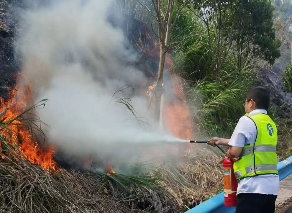 巡查員立即啟動有關(guān)應(yīng)急預(yù)案程序,撥打火警電話通知消防部門和杭瑞路段集中監(jiān)控點,并通過與通山收費站的積極協(xié)調(diào),借用了通山收費站口備用滅火器、調(diào)用了管理所水車,隨即巡查員化身“消防員”,第一時間沖向火場。他們猶如一群無畏的勇士,面對熊熊大火和滾滾濃煙,沒有絲毫退縮。他們熟練地操作著滅火設(shè)備,有的拿著滅火器,精準(zhǔn)地對著火源根部噴射;有的則端起消防水槍,噴向一仗多高的火焰。在滅火過程中,大家分工明確、配合默契,經(jīng)過他們的不懈努力,火勢終于得到了有效控制,保護了臨近天橋和光纜。將一場火災(zāi)消滅在萌芽之中,保障了人民的生命財產(chǎn)安全。