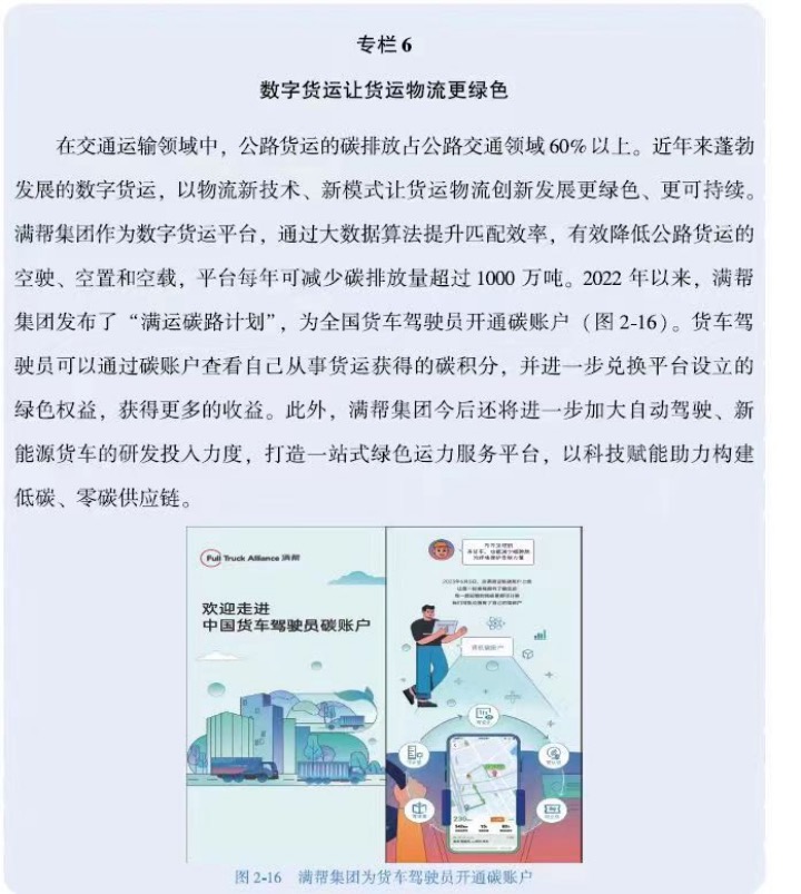 為了讓廣大貨車司機(jī)也享受到節(jié)能減碳的好處,2023年6月,滿幫為全國3000多名貨車司機(jī)開通碳賬戶,這也是中國公路貨運(yùn)領(lǐng)域的首個(gè)碳賬戶。目前已有超過100萬貨車司機(jī)開通碳賬戶。貨車司機(jī)可以通過碳賬戶查看自己從事運(yùn)貨獲得的碳積分,并進(jìn)一步兌換平臺(tái)設(shè)立的綠色權(quán)益,獲得更多實(shí)實(shí)在在的收益。滿幫將基于碳賬戶打造的綠色信譽(yù)體系,推動(dòng)產(chǎn)業(yè)鏈同頻共振,通過價(jià)值共創(chuàng)協(xié)同產(chǎn)業(yè)鏈上下游企業(yè)和用戶一同加入減碳行列。例如滿幫聯(lián)合中國光大銀行推出的“綠色物流+金融”服務(wù)已經(jīng)正式上線,雙方基于司機(jī)碳賬戶建立起互認(rèn)互信的綠色信譽(yù)體系,率先將“綠色評(píng)價(jià)因子”作為金融機(jī)構(gòu)評(píng)價(jià)貨車司機(jī)信用的重要指標(biāo),綠色評(píng)價(jià)較高的司機(jī)將在貸款額度、利率、還款周期等方面享有綠色特權(quán)。此舉將進(jìn)一步提升貨車司機(jī)在金融服務(wù)領(lǐng)域的體驗(yàn)感、獲得感,鼓勵(lì)更多的貨車司機(jī)提升節(jié)能減碳意識(shí),成為交通運(yùn)輸領(lǐng)域“碳達(dá)峰、碳中和”道路上的主力軍。