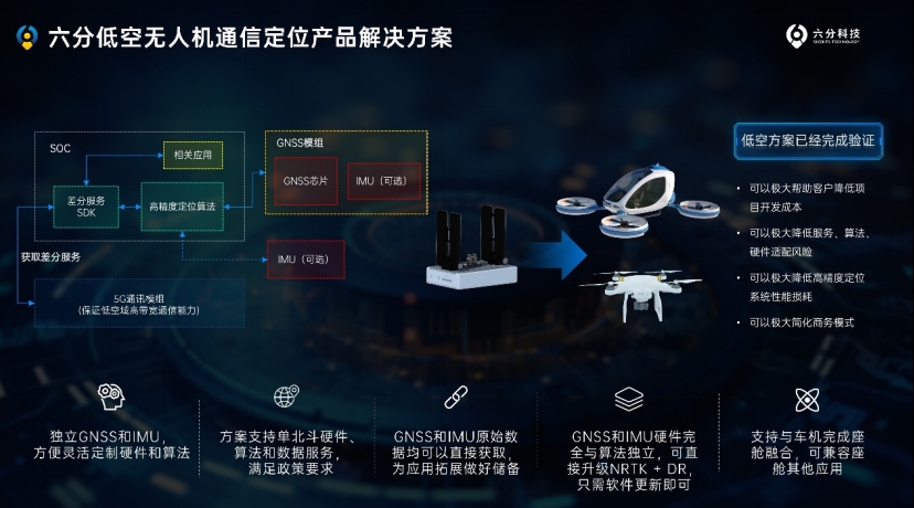 六分科技通過覆蓋全國的CORS基站,自研終端RTK算法與組合導(dǎo)航算法,以“網(wǎng)-云-端”一體化解決方案為海量用戶提供5系統(tǒng)16頻點(diǎn)全天候、實時厘米級和亞米級的高精度定位服務(wù),廣域高可靠、高可用、快速收斂等技術(shù)優(yōu)勢為服務(wù)低空經(jīng)濟(jì)奠定基礎(chǔ)。