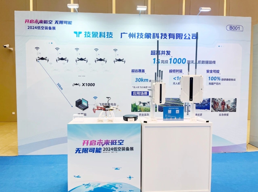 技象科技也展出了基于TPUNB的低空無人機通信解決方案,具備超高并發(fā)、超遠覆蓋、超低時延等優(yōu)點,可在1秒內完成1000架無人機的數據回傳,無人機與地面站的通信時延小于1毫秒。