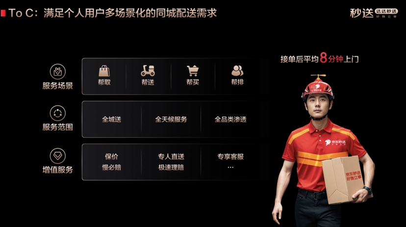 達(dá)達(dá)秒送跑腿服務(wù)涵蓋幫取、幫送、幫買、幫排隊(duì)等多樣化需求,接單后平均8分鐘即可上門,可為個人用戶提供全城送、全天候服務(wù),并實(shí)現(xiàn)對商超零售、餐飲外賣、鮮花蛋糕等全品類滲透;在增值服務(wù)方面,達(dá)達(dá)秒送切中訂單的“安全”痛點(diǎn),提供保價、專人直送、專享客服、慢必賠、極速理賠等多種精細(xì)化服務(wù)。
