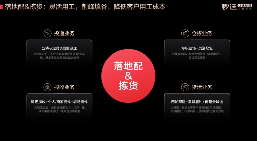 除品牌商家外,達(dá)達(dá)秒送多元化產(chǎn)品方案覆蓋各類客戶。達(dá)達(dá)秒送能為個人用戶提供幫取、幫送在內(nèi)的專業(yè)跑腿服務(wù);落地配和揀貨業(yè)務(wù),則為眾多知名物流企業(yè)和零售商超打造專業(yè)的“最后3公里”物流解決方案,提供削峰填谷、靈活用工服務(wù),成為物流履約“穩(wěn)定器”。