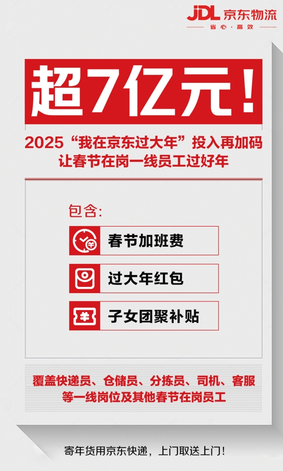 蛇年春節(jié)臨近,年味漸濃,全國各地購買年貨和寄遞需求正迎來高峰。作為年貨節(jié)和春節(jié)物流服務(wù)的主力保障,京東物流連續(xù)第13年“春節(jié)也送貨”,保障每一份思念與祝福的準時送達。同時,為了讓堅守崗位、原地過年的一線員工能夠安心工作,今年京東物流持續(xù)升級 “我在京東過大年” 福利保障,總投入超7億元,提供一系列超國家法定標準的福利補貼。