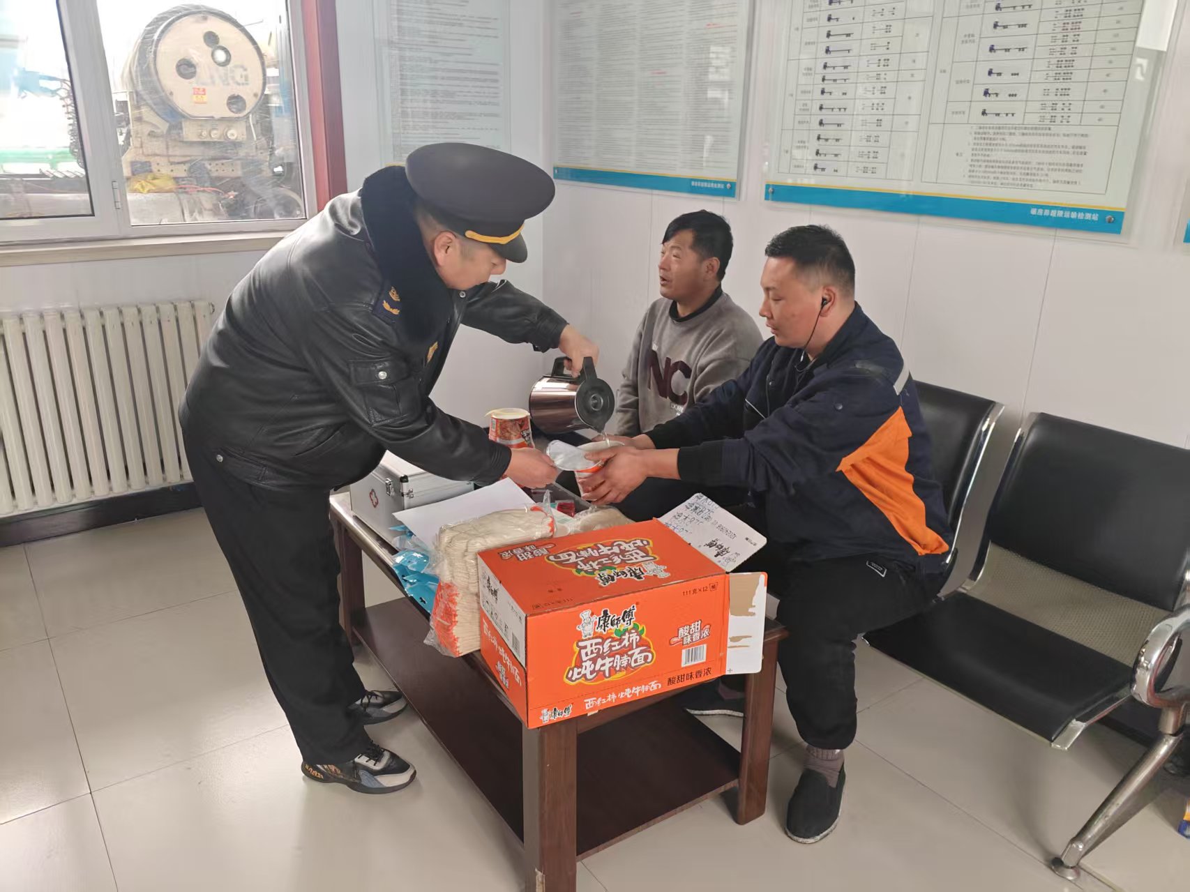 工作人員熱情地將一杯杯熱騰騰的開水遞到司機(jī)手里,那些蒸騰的熱氣似乎瞬間就能驅(qū)散寒冷。泡面的香味在休息區(qū)內(nèi)彌漫開來(lái),每個(gè)吃到泡面的司機(jī)臉上都洋溢著感激的神情。一位司機(jī)師傅激動(dòng)地說(shuō):“大過(guò)年的,雪又大,我都沒地方吃飯休息了。這里的服務(wù)這么好,真的太感謝你們超限站了。”