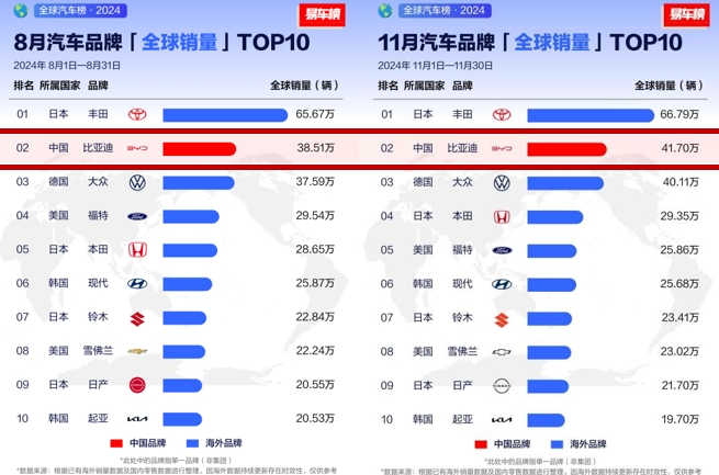 2024年,易車公布的全球汽車品牌銷量TOP10榜單中,比亞迪在8月、11月,均斬獲了第2名的佳績。