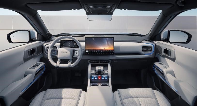 座艙內(nèi),飛翼式儀表臺、C形星際氛圍燈與豹系家族同款的“戰(zhàn)車檔把+水晶按鍵”,構(gòu)建出極具科幻力的駕駛氛圍;AI智能座艙與多功能靈動島,支持語音交互、場景模式一鍵切換,15.6英寸中控屏、12英寸HUD與帝瓦雷音響,搭配人體工學座椅與冷暖冰箱,讓每一程都沉浸于舒適與潮流樂趣中。