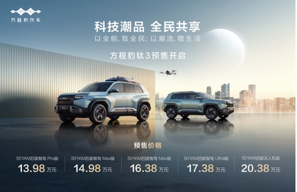 2025年3月31日,比亞迪個性化品牌方程豹旗下全新車型鈦3正式開啟預(yù)售,正式布局緊湊型SUV市場。鈦3定位科技潮品SUV,搭載其獨有的潮流配置“1機3艙”,以及“iCT”安全三件套、“E+2C”智能三件套,實現(xiàn)了科技越級、空間越級、配置越級,以拉滿的產(chǎn)品價值滿足廣大消費者多元化場景和生活需求,非常適合都市和家用,開創(chuàng)科技潮品新時代。比亞迪集團方程豹汽車總經(jīng)理熊甜波現(xiàn)場公布了方程豹鈦3的5個版本及預(yù)售價格:501KM后驅(qū)智駕Pro版13.98萬元,501KM后驅(qū)智駕Max版14.98萬元,501KM四驅(qū)智駕Max版16.38萬元,501KM四驅(qū)智駕Ultra版17.38萬元,501KM四驅(qū)無人機版20.38萬元,超值的價格給予了廣大用戶極大的驚喜。