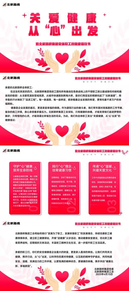 北新路橋集團(tuán)工會(huì)始終踐行“發(fā)展為了職工、發(fā)展依靠職工”的發(fā)展理念,在不斷完善職工健康保障體系的基礎(chǔ)上,于4月15日發(fā)出《健康倡議書》,引導(dǎo)全體職工守護(hù)“心”健康、踐行“心”理念,向全體職工傳遞“心”溫暖。