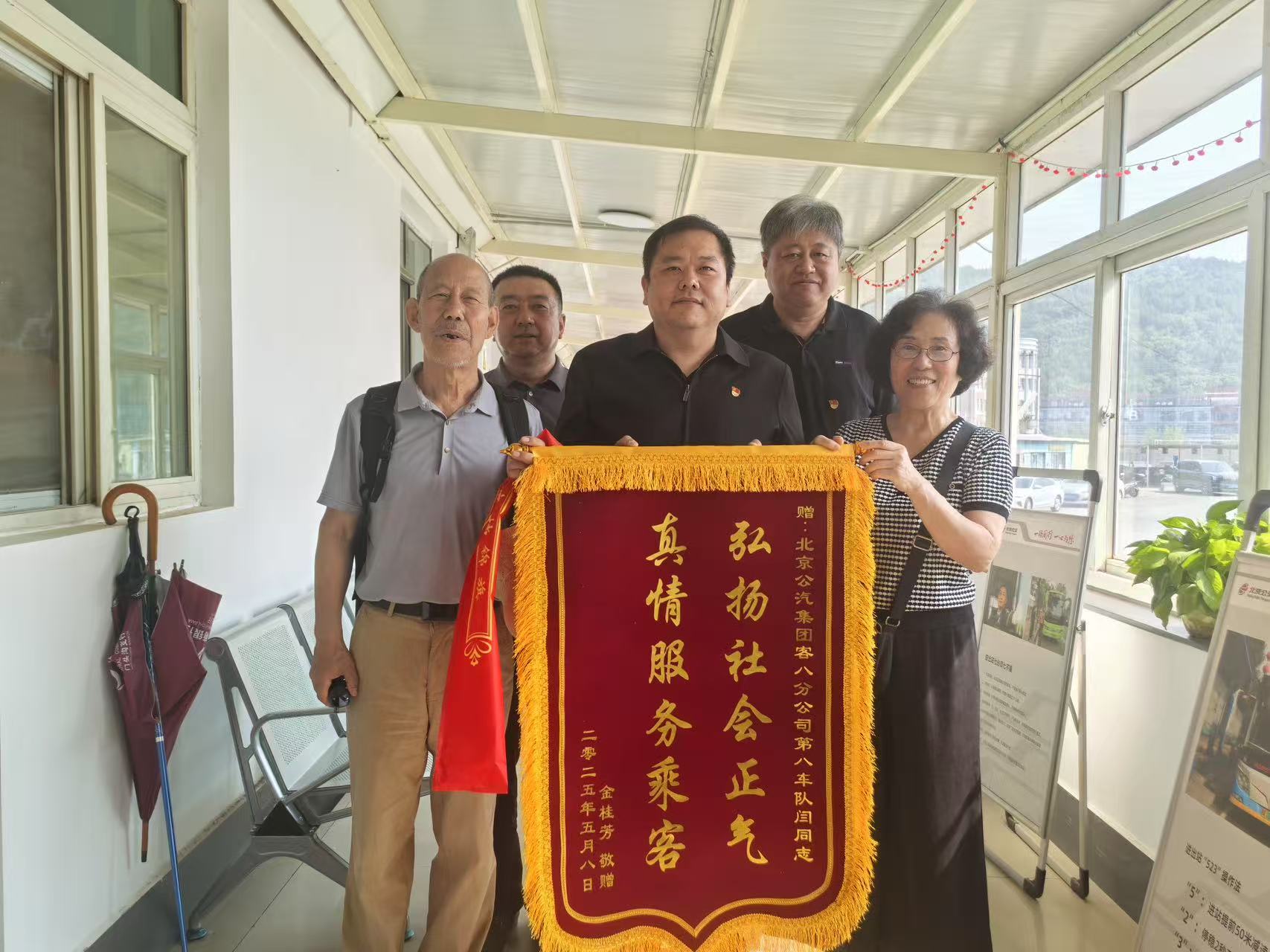 “這張卡不僅能坐車,還能消費......”5月20日,市民金女士將繡有"弘揚社會正氣,真情服務乘客"的錦旗送到北京公交集團客八分公司第八車隊,為公交人跨部門接力追回紀念卡余額的暖心服務點贊。