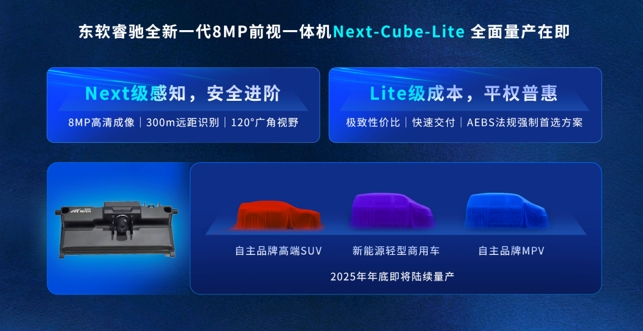 論壇期間,東軟睿馳正式發(fā)布全新一代8MP前視一體機——Next-Cube-Lite,兼顧安全可靠、極致性能,同時覆蓋乘用車與商用車多場景應用,為車企提供一套極致性價比、快速交付的高性能輔助駕駛產(chǎn)品。近期,此款產(chǎn)品接連斬獲頭部車企量產(chǎn)定點,正成為車企應對新規(guī)、強化主動安全能力、提升整車智能化競爭力的首選,為用戶帶來更加智能、安全的出行體驗。
