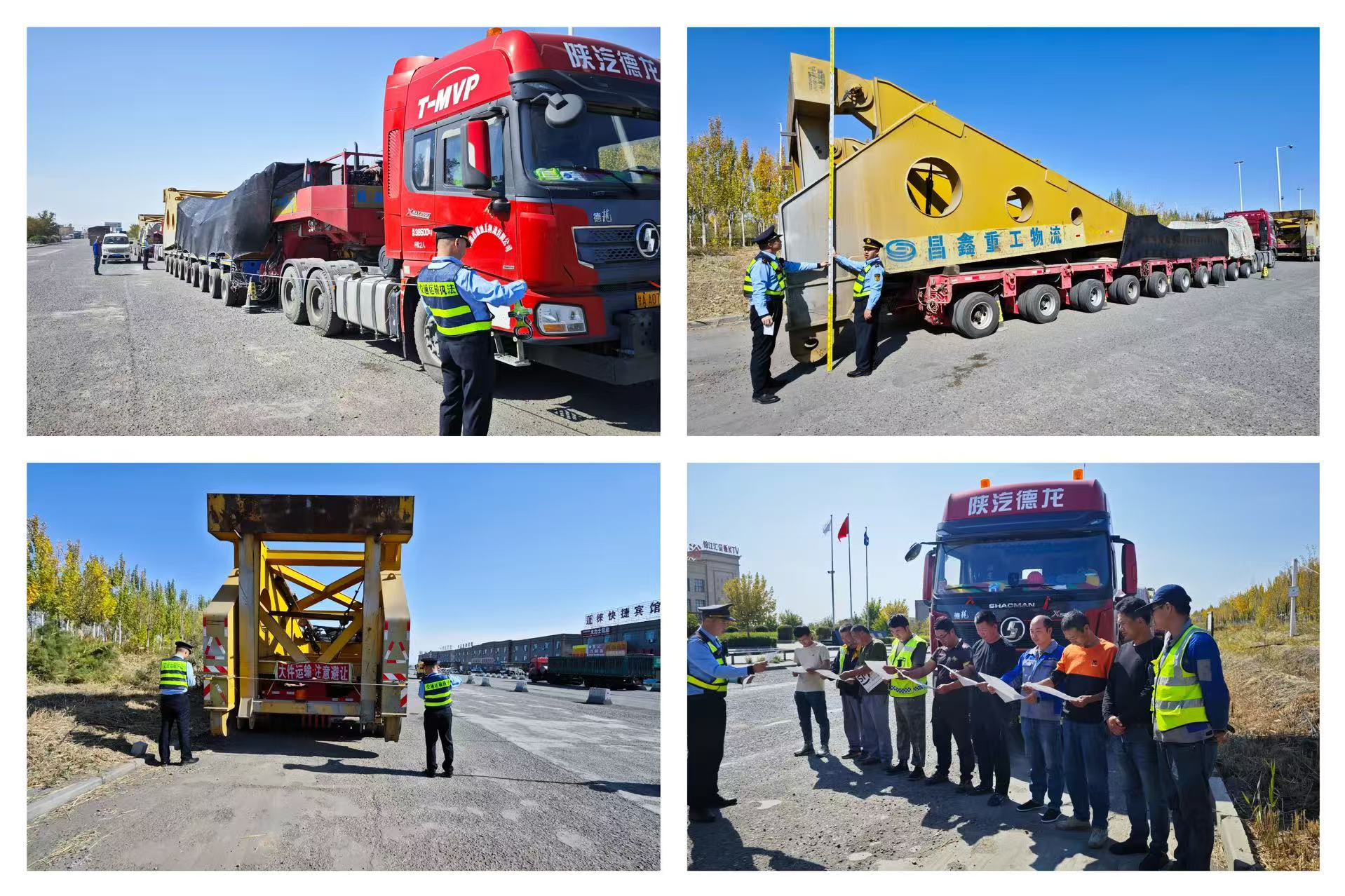 9月23日11時20分,昌吉執(zhí)法支隊吉木薩爾執(zhí)法大隊接到新疆大件運輸許可管理系統(tǒng)推送的大件運輸車輛核查信息后,執(zhí)法人員第一時間與大件申請經辦人取得聯(lián)系,了解大件運輸車輛裝載情況、車輛行駛路線以及到達核查點位時間,立即前往五彩灣工業(yè)園區(qū)G216線九州物流園,按照《大件運輸許可便民服務手冊》規(guī)定,對甘肅昌鑫重工物流有限公司4輛拉運工裝梁大件運輸車輛進行現(xiàn)場核查勘察。