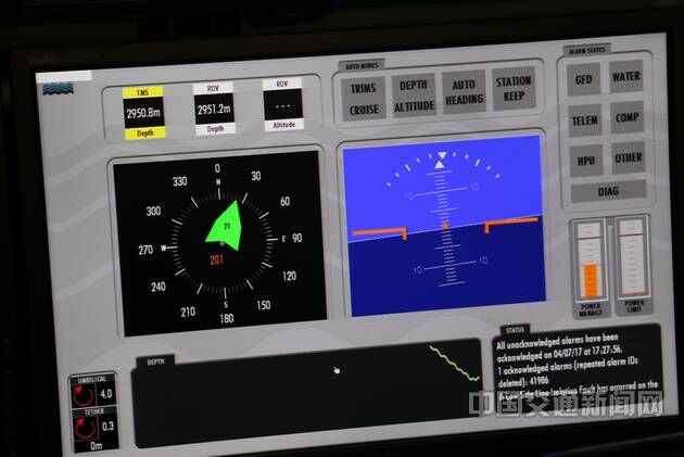 4月5日13點(diǎn),“德渼”輪搭載ROV設(shè)備起航,前往南海預(yù)定海試地點(diǎn)。4月6日和7日,ROV先后兩次下水,下潛最大深度分別為1180米和2951米,還進(jìn)行了出籠飛行,成功檢測(cè)了設(shè)備的耐壓性和穩(wěn)定性。4月8日13點(diǎn)08分,現(xiàn)場(chǎng)海域氣象條件良好,ROV第三次下水正式開(kāi)始。伴隨著發(fā)電機(jī)巨大的轟鳴聲,ROV收放系統(tǒng)開(kāi)始運(yùn)轉(zhuǎn),停放在工作平臺(tái)上的ROV被平穩(wěn)吊起,慢慢放入水中。經(jīng)過(guò)一個(gè)半小時(shí)的下潛,當(dāng)水深至2735米時(shí),ROV成功到達(dá)海底。按照預(yù)定方案,ROV飛離臍帶纜管理系統(tǒng),進(jìn)行了600米的水下飛行。同時(shí),技術(shù)人員操縱高精度機(jī)械手,將象征著中國(guó)救撈挺進(jìn)深水的種子撒播在了南海海底。隨后,技術(shù)人員對(duì)ROV各主要傳感器、各輔助設(shè)備、機(jī)械液壓系統(tǒng)、通信傳輸及自動(dòng)控制系統(tǒng)等進(jìn)行了測(cè)試,所有性能和參數(shù)一切正常。18點(diǎn)30分,完成全部測(cè)試項(xiàng)目后,ROV開(kāi)始返回水面。晚上20點(diǎn),ROV順利出水。據(jù)煙臺(tái)打撈局技術(shù)人員介紹,接下來(lái)ROV設(shè)備將正式交付使用,煙臺(tái)打撈局救撈裝備庫(kù)再添重器。
