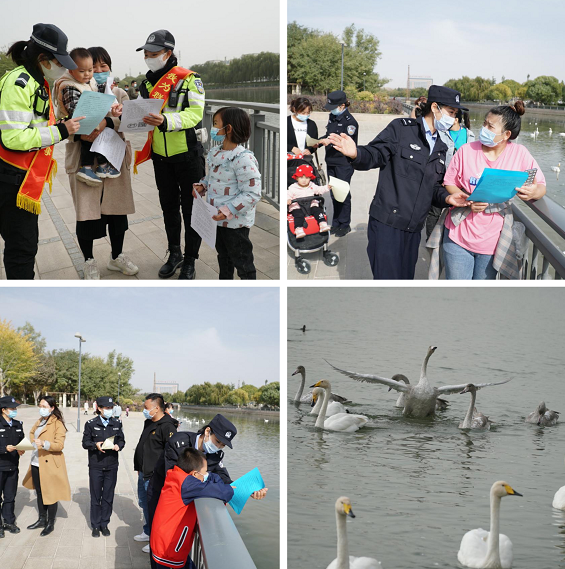連日來,庫爾勒市公安局交警大隊多次組織騎警中隊、宣傳中隊的民警輔警來到杜鵑河、孔雀河為野生天鵝投放饅頭、馕餅等“美食”的同時,還向廣大市民和游客宣傳《中華人民共和國野生動物保護法》和《中華人民共和國道路交通安全法》,以吸引更多的野生天鵝呼朋引伴、拖家?guī)Э诩娭另硜恚鼈?ldquo;飛來不向走”,在庫爾勒水域安全越冬。