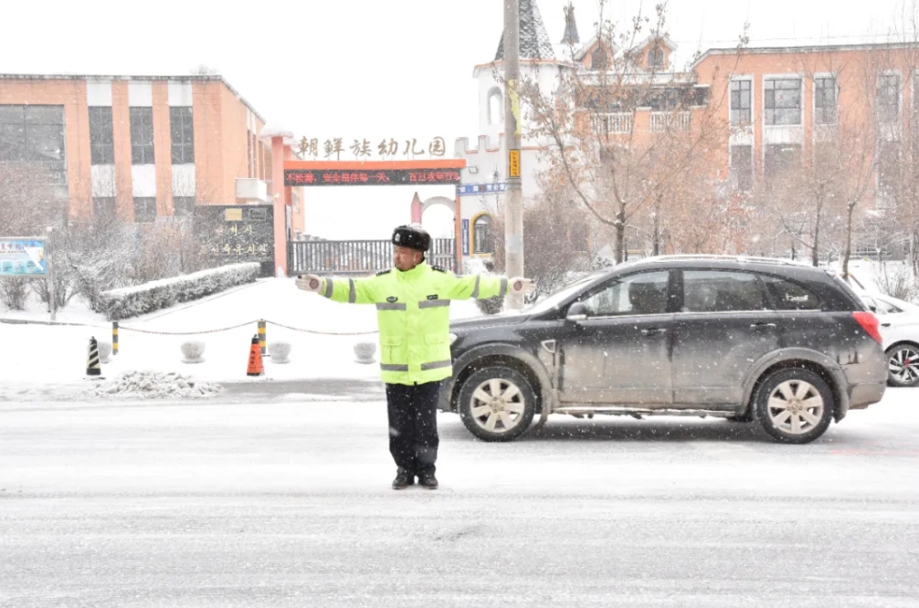 在通化輝南,當地交警部門迅速啟動惡劣天氣應急處置預案,全體民警輔警冒雪堅守崗位,在漫天風雪中全力確保道路安全暢通。