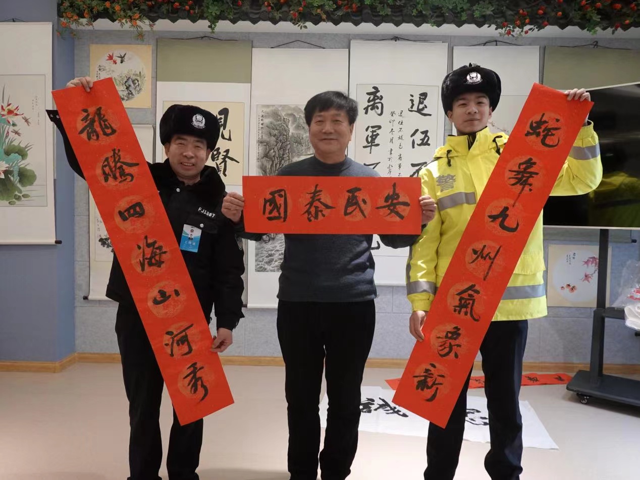 在第五個(gè)“中國人民警察節(jié)”來臨之際,為營造濃厚節(jié)日氛圍,豐富警營文化生活,1月7日,新疆庫爾勒市公安局交警大隊(duì)與庫爾勒市梨香街道凌達(dá)社區(qū)聯(lián)合邀請巴州美協(xié)副主席王建國巴州和庫爾勒市警民知名書法家王禮、李國等人共赴一場翰墨之約,開展“翰墨抒忠誠、書法踐初心”致敬警察節(jié)主題活動(dòng),書寫人民警察奮發(fā)有為、昂揚(yáng)向上的精神面貌,進(jìn)一步凝聚警心、激勵(lì)斗志用筆墨丹青書寫忠誠和奉獻(xiàn)精神。