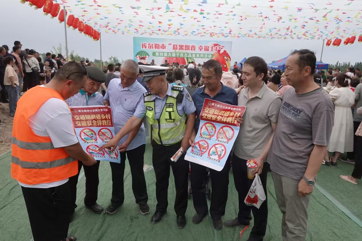 7月6日,新疆庫爾勒市“瓜果飄香、幸福上戶"第四屆大墎子西瓜品鑒系列活動在上戶鎮(zhèn)大墎子村三組隆重舉行,庫爾勒市公安局交警大隊堅持警務(wù)跟著警情走、服務(wù)圍著百姓轉(zhuǎn),積極探索強(qiáng)宣傳、齊發(fā)力、促服務(wù)、凝聚合、保安全等“田園警務(wù)”新模式,采取警務(wù)前移,警力前置,上下聯(lián)動,在抽調(diào)足夠警力確保道路交通安全、有序、暢通的前提下,還組織民警輔警大力開展“護(hù)航西瓜品鑒會、交通安全警相隨”為主題的“美麗鄉(xiāng)村行”交通安全巡回宣講活動,民警輔警主動深入到活動現(xiàn)場、售瓜攤位向廣大瓜農(nóng)、市民和游客“面對面”講法律、“零距離”話安全、“實打?qū)?rdquo;送服務(wù),讓交通安全宣傳落筆美麗鄉(xiāng)村。