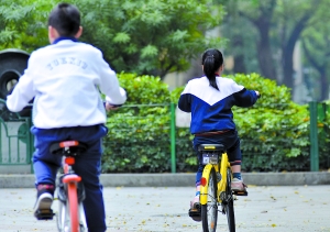 在街頭騎共享單車的小學(xué)生。