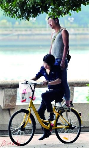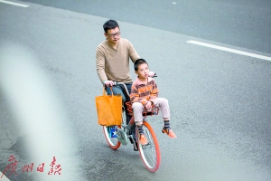 昌崗東路,大人騎著共享單車,小孩坐在車頭。