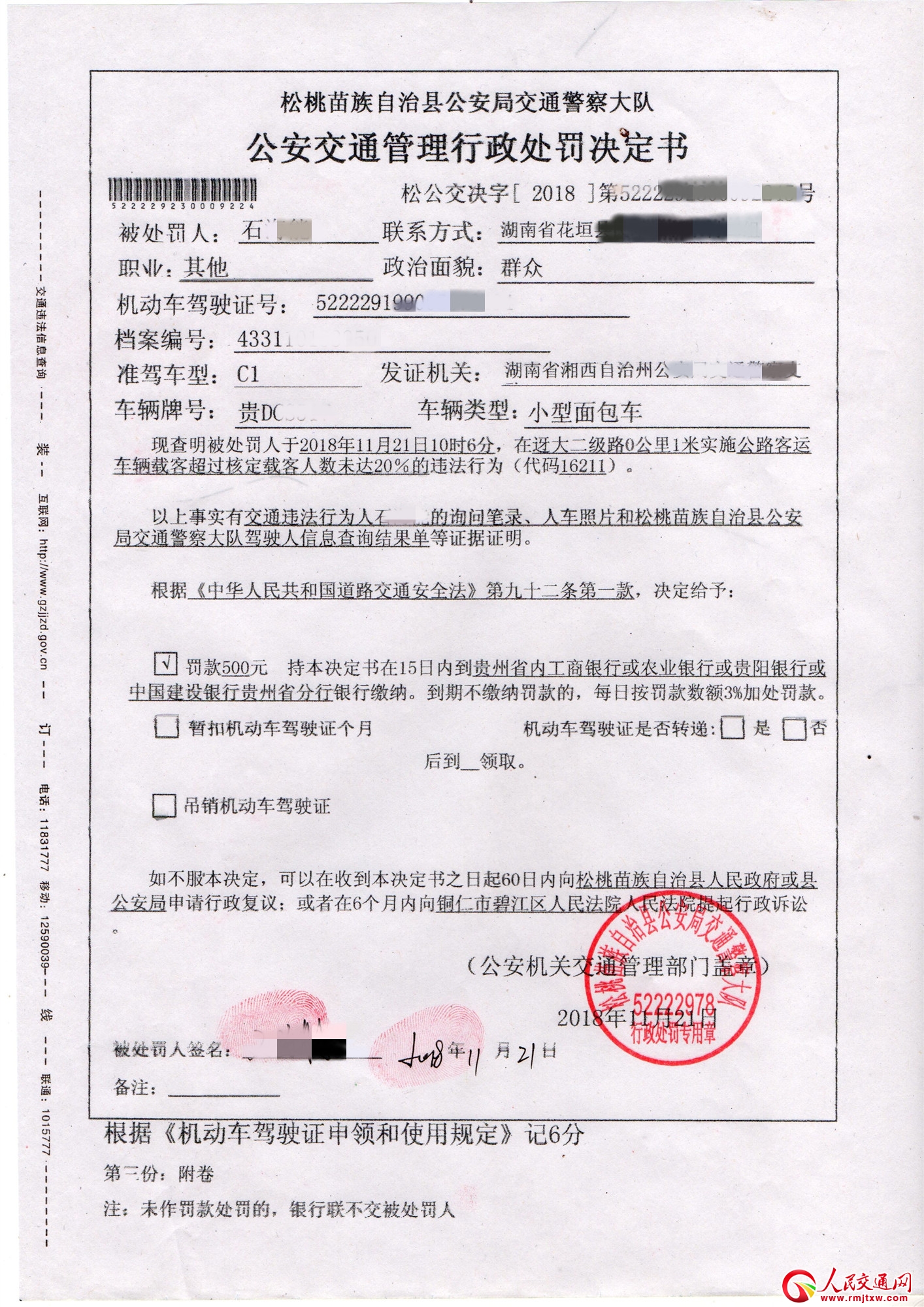 2018年11月21日上午10點(diǎn)06分,松桃苗族自治縣公安局交警大隊(duì)執(zhí)勤民警按照大隊(duì)勤務(wù)工作要求正常執(zhí)勤巡邏,對(duì)過往客車進(jìn)行檢查登記,認(rèn)真落實(shí)7座以上客車六必查措施。10時(shí)06分民警巡邏至迓大二級(jí)路0公里1米處時(shí),一輛車牌號(hào)為貴DCXXXX的小型普通客車行駛至迓大二級(jí)路0公里1米處時(shí),被執(zhí)勤交警當(dāng)場(chǎng)查獲,經(jīng)查,該車核載9人,經(jīng)現(xiàn)場(chǎng)清點(diǎn)人數(shù),該車實(shí)載載10人,超員人數(shù)未達(dá)20%,屬于超員違法行為。民警當(dāng)即對(duì)駕駛員進(jìn)行批評(píng)教育,并按法律程序進(jìn)行駕駛證記6分和罰款500元的處罰,將超出的乘客進(jìn)行轉(zhuǎn)運(yùn),消除了事故隱患。同時(shí)對(duì)該起嚴(yán)重違法行為通報(bào)掛靠客運(yùn)企業(yè)及當(dāng)?shù)剡\(yùn)管部門。經(jīng)教育批評(píng)后駕駛?cè)艘庾R(shí)到違法超載的嚴(yán)重后果,并保證今后嚴(yán)格遵守法律法規(guī),文明駕駛,安全出行。