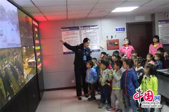 碑林大隊民警作為“導游”,帶領(lǐng)小朋友到辦案中心、指揮中心等小朋友們從未見過的地方進行參觀,還講解了大隊“鐵騎”摩托車,交警單警裝備等,孩子不時發(fā)出贊嘆的呼聲。指揮中心輔警李曉玫非常親切而熱心的為小朋友們演示了指揮中心的多功能屏幕,并熟練的調(diào)取了幾名小朋友家附近的監(jiān)控,用不一樣的視角,讓小朋友看到了自己熟悉的路段,小朋友們大呼神奇。