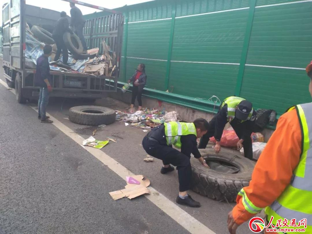 接警后,大隊民警立即組織人員驅(qū)車趕往事故現(xiàn)場,并立即聯(lián)系道路救援清障部門共同前往處置。民警到達現(xiàn)場后,事故現(xiàn)場一片狼藉,小貨車側(cè)躺在應(yīng)急車道,車輛散落的貨物占據(jù)行車道,對道路交通安全通行帶來極大的威脅。