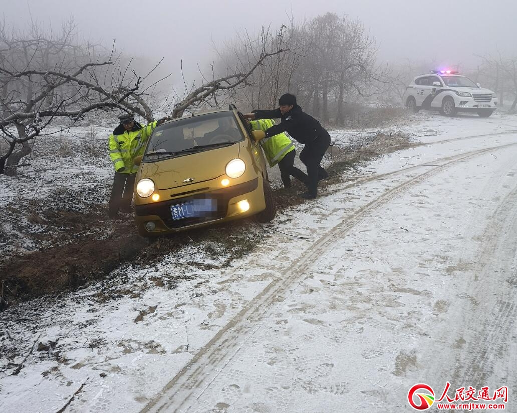 9時(shí)30分許,臨晉中隊(duì)民警王政、岳強(qiáng)、王帥、候朝陽(yáng)等人巡邏至馮留村附近路段時(shí),發(fā)現(xiàn)一輛牌號(hào)為晉MLN2**的小型轎車(chē)滑到了行道樹(shù)坑,駕駛員毛某某站在車(chē)旁?xún)龅纳l(fā)抖。于是民警立即把警車(chē)?亢蠓剑_(kāi)啟爆閃,設(shè)立警示標(biāo)志,一人指揮疏導(dǎo)過(guò)往車(chē)輛有序通行,防止二次事故發(fā)生,其余人立即上前展開(kāi)救援。經(jīng)過(guò)10多分鐘努力,民警們終于把被困車(chē)輛安全推出樹(shù)坑,并再三叮囑毛某某,雪天路滑,一定要慢速、謹(jǐn)慎駕駛。