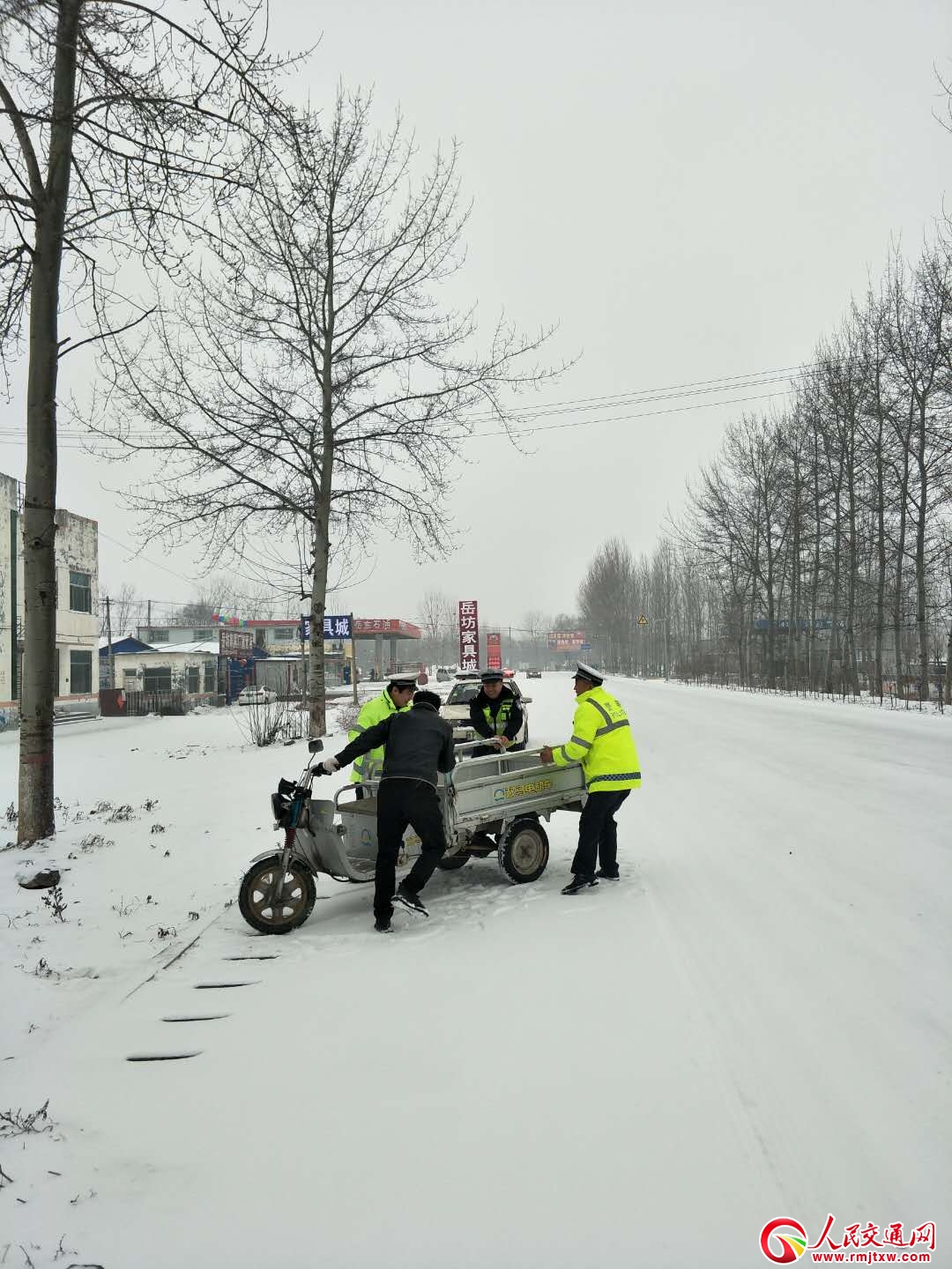 9時10分許,在觀城中隊西200米處,發(fā)現(xiàn)一輛小型面包車停在道路中間一動不動,而駕駛人在道路上左顧右盼,還不 停地打電話。執(zhí)勤民警立即上前詢問情況,經(jīng)了解,該車因輪胎沒氣被迫停在了路中間。民警考慮雪天路滑,易發(fā)生追尾事故,雪情就是警情,警情就是命令。于是,民警一邊向駕駛人講解雪中車輛亭路中間存在的安全隱患,一邊安排輔警和駕駛人一起將車輛一步一步推至路邊安全地帶,等待救援車輛。直至安全后,執(zhí)勤民 警才踏上雪中執(zhí)勤的道路......