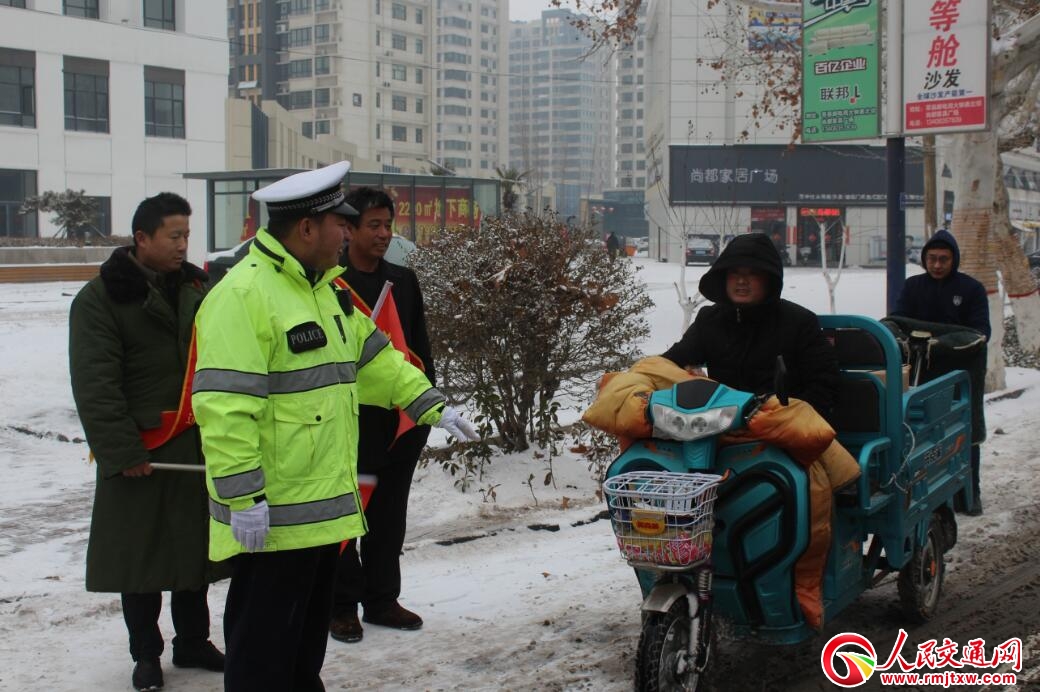 雪天增大了城鄉(xiāng)道路交通壓力,莘縣交警堅(jiān)守在分包路段,強(qiáng)化路面巡邏管控、指揮疏導(dǎo),通過引導(dǎo)、分流車輛,防止發(fā)生長(zhǎng)時(shí)間、大面積的交通擁堵和重大交通事 故,最大限度地消除道路交通安全隱患,確保轄區(qū)道路安全暢通、有序。在道路交通管控中,民警通過加大路面巡邏力度,巡邏警車開啟警燈,利用車載喊話器提醒 過往車輛減速慢行、保持安全車距,全力消除雨雪天氣給交通參與者出行和道路交通管理工作帶來的諸多不便,確保道路交通環(huán)境安全暢通。根據(jù)道路能見度和路面 通行條件,莘縣交警主動(dòng)協(xié)調(diào)交通、路政、住建、應(yīng)急管理等部門,在城區(qū)路段和國(guó)省道、縣鄉(xiāng)道易積雪、結(jié)冰路段設(shè)置警示提示標(biāo)志和臨時(shí)限速標(biāo)牌,儲(chǔ)備沙石、 融雪化冰等應(yīng)急物資。在重點(diǎn)路段備好應(yīng)急救援、清障施救車輛、設(shè)備和裝備,遇有交通事故等突發(fā)情況,快速出警、快速處置、快速施救、快速清理現(xiàn)場(chǎng),盡早恢 復(fù)道路正常通行。